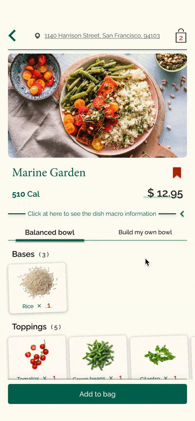 I designed to hide the irrelevant information until it becomes relevant. The macronutrient chart won’t be shown in the first place until the users want to know more. Besides, the users will also have a delightful sense of control by tapping to drop the chart down.